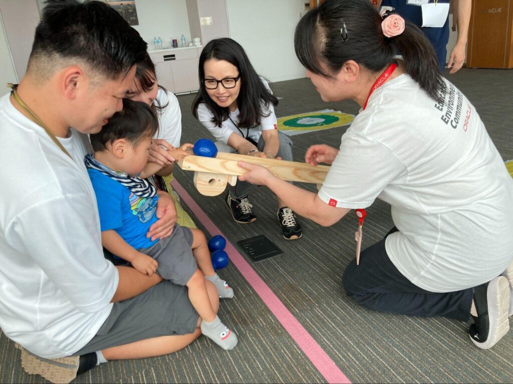「インクルーシブ・テック」のプロジェクトでは、オラクルから提案して、社員のこどもたちにも「イベント盛り上げ隊」として参加してもらいました。オラクルの社員には、「ボランティア活動は楽しみながらやろう」と伝えていて、真面目な活動のなかにも楽しさの“たね”を見つけて、それを思いっきり楽しんでもらうことを意識してもらっています。オラクルのボランティアたちの楽しさが会場に伝播していき、みんなが心から笑って盛り上がり、健常の子と障害のある子が一緒に遊ぶという場を作ることができました。