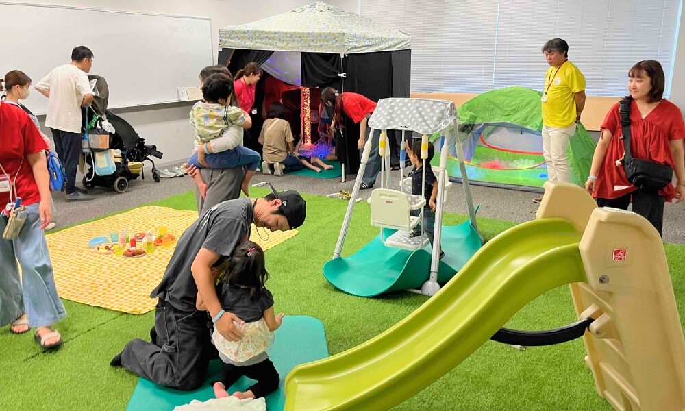 今回の家族交流会でも発見がありました。ボールプールなどの遊具を用意した「室内公園」のお部屋がガラス張りになっていて、たまたま通りがかったご家族から一緒に遊べるかお声がけがあったんです。