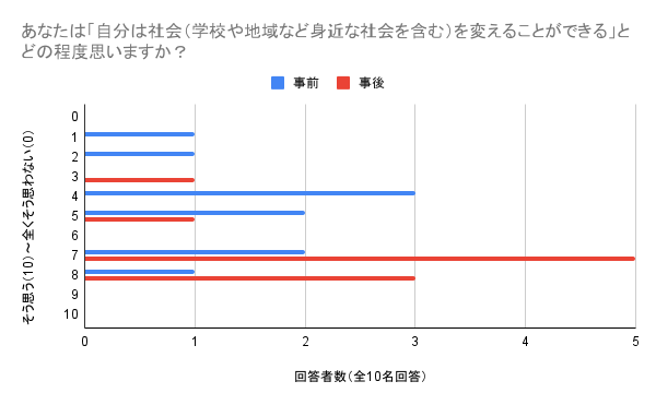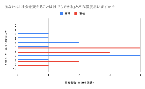 まず、「あなたは『社会を変えることは誰でもできる』とどの程度思いますか?」という質問について、10段階で聞いたアンケートでは、実施前と実施後では+1.9ポイントの変化が。