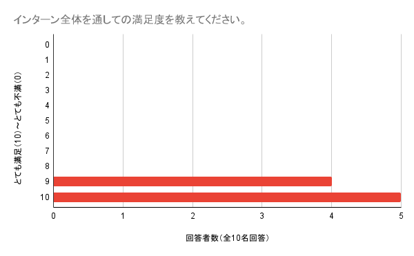 また、インターンの満足度を聞いた質問では10段階中平均9.5と、高い満足度であったこともわかりました。