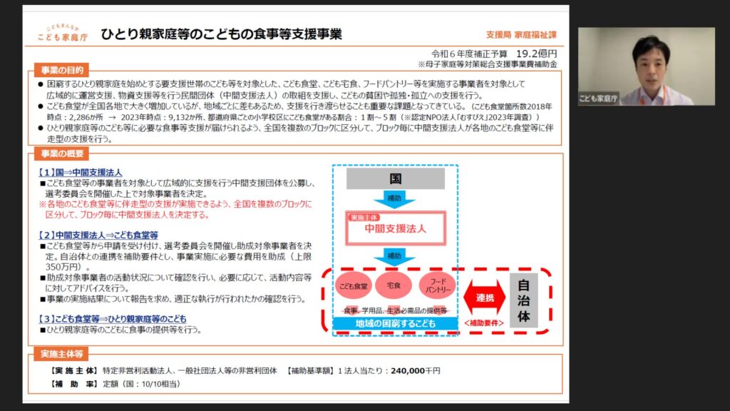 事例共有会では、こども家庭庁支援局家庭福祉課(こどもの貧困対策担当)の川上涼様より「ひとり親家庭等のこどもの食事等支援事業」について説明がありました。