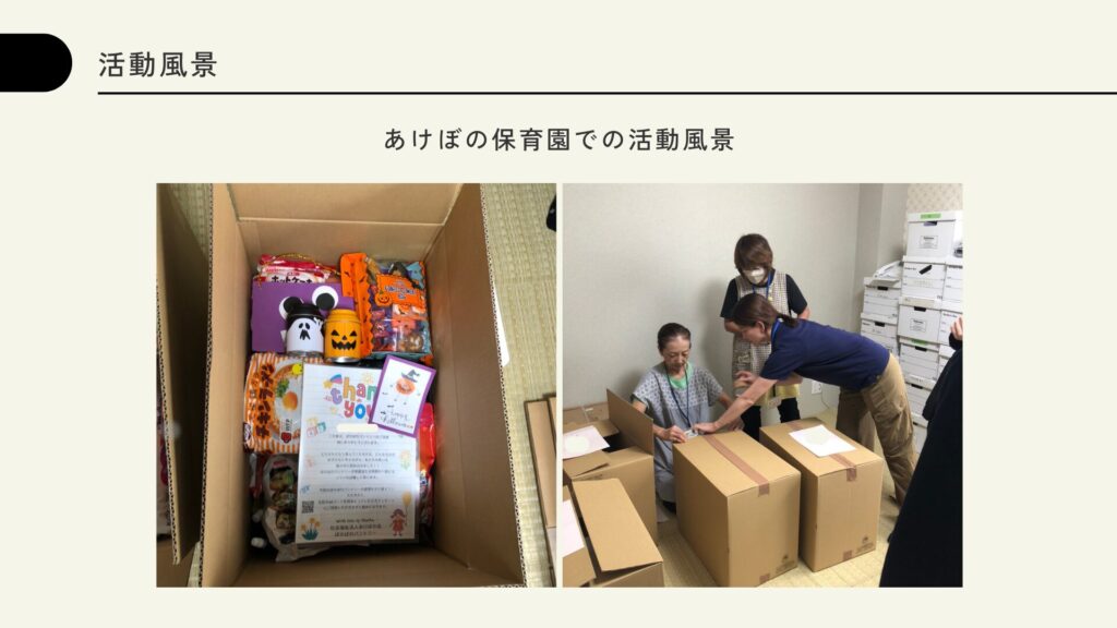 こちらの団体では、利用家庭に合わせてオーダーメイドで食品等を選んでお渡ししており、支援物品と合わせて、園が運営する子育て支援センターの案内も同封し、利用を促しています。またハロウィンやクリスマスなどの季節には手紙や飾りを同封するなど、「気持ちが伝わる支援」を大切にしています。