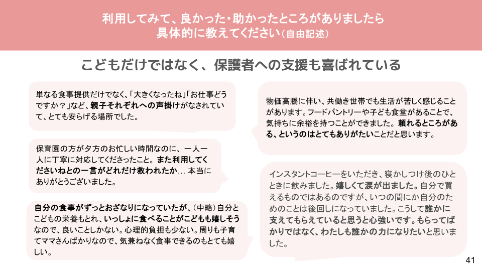 利用者からのコメントでは、「食事だけでなく声をかけてもらえてうれしかった」「忙しい中でも一言が心の支えになった」といった、保護者への何気ない心づかいが喜ばれていることがうかがえます。