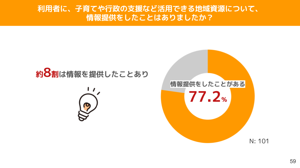 また、子育てや行政の支援など活用できる地域資源について、利用者に情報提供を行った事業者は77.2%でした。