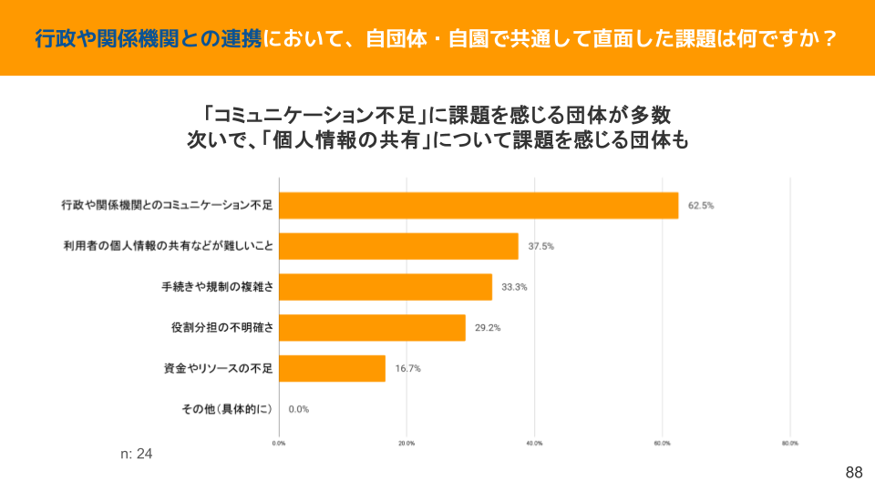 一方で、課題として「行政や機関とのコミュニケーション不足」や「利用者の個人情報の共有の難しさ」なども挙げられており、これらの解決が行政連携強化につながると考えられます。