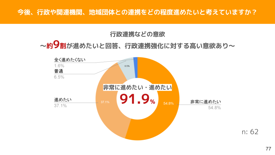 9割以上の事業者が「今後も行政との連携を深めたい」と考えており、地域連携について前向きな姿勢がうかがえました。