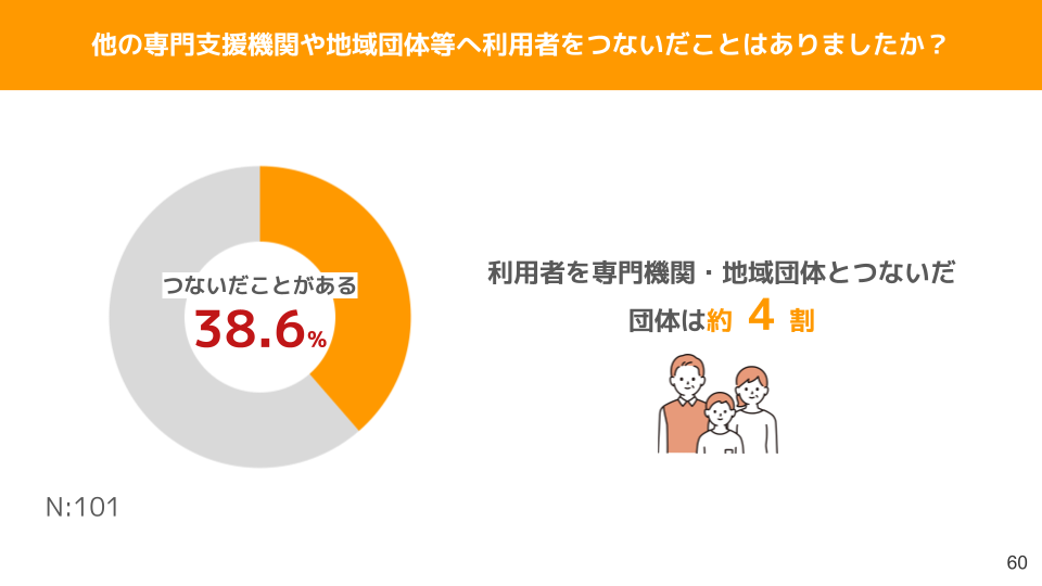 事業者の38.6%が、利用者を他の専門支援機関や地域団体等へつないだと回答しました。食支援事業によって出会うことができた心配なご家庭を、地域の中で見守り、必要な支援につなげています。