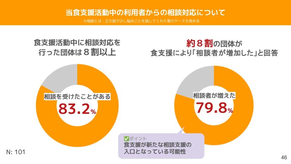 「食支援事業によって相談者が増加した」と回答した事業者は、79.8%でした。食支援の利用が「困ったことを話すきっかけ」となっており、新たな相談支援の入口として食支援が有効であることがわかります。