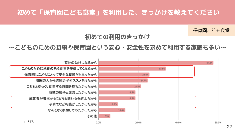 利用者アンケートでも、保育園こども食堂を利用したきっかけとして、「こどもに栄養のある食事の提供」、「こどもにとって安全な環境」、「普段からこどもと関わる保育士の存在」「子育て相談」などが挙げられており、保育園だからこそ低年齢児の親子に選ばれたことがうかがえます。