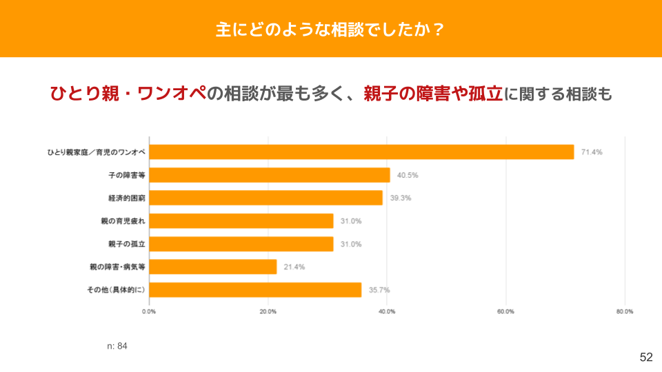 相談の内容は、育児やひとり親家庭に関すること、親子の孤立など多岐にわたっています。