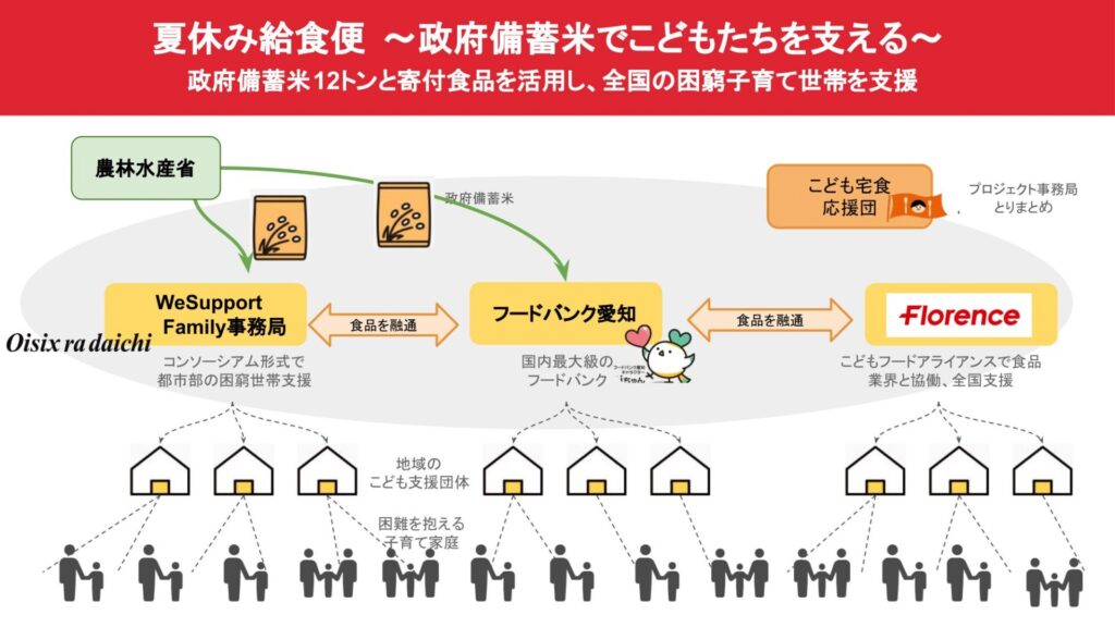 「夏休み給食便 ~政府備蓄米でこどもたちを支える~」は、フローレンス、こども宅食応援団、フードバンク愛知、WeSupport Family運営事務局のオイシックス・ラ・大地の4法人共同で、全国の困りごとを抱える子育て家庭に対して緊急で政府備蓄米や食品をお届けする取り組みです。
