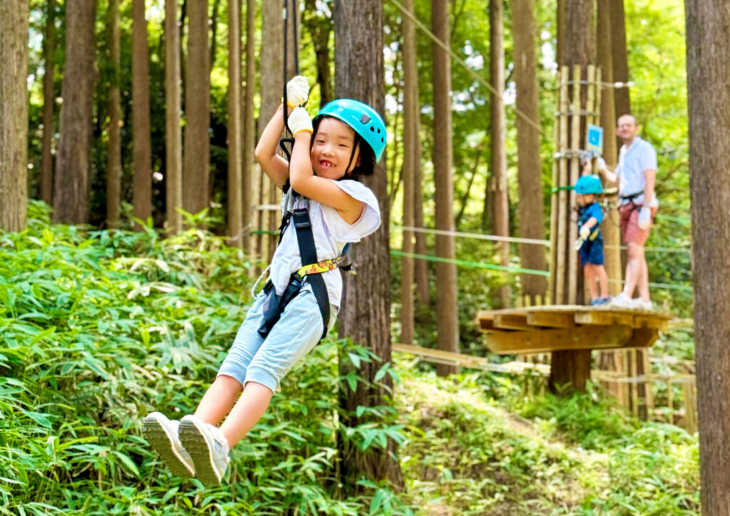 【内容】自然の立ち木の上に作られた樹間のアクティビティを渡り、最後はジップスライドで滑り降ります。専用のハーネスを着用し、安全講習をうけて自身で安全器具を操作しながらコースを進んでいきます。親子で楽しく体を動かせる施設です。