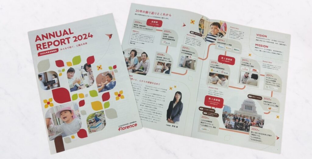 20年の歩みを振り返るとともに、それぞれの事業から生まれた声、スタッフの声、フローレンスをご支援くださる皆さんの声をつないで、2024年度の活動を1冊にまとめました。
