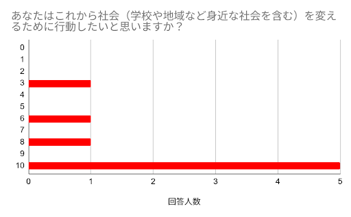 また、「あなたはこれから社会(学校や地域など身近な社会を含む)を変えるために行動したいと思いますか?」という質問には、参加人数の半数以上の5名が「とてもそう思う」と回答。事前アンケートの「今までに社会を変えるために行動したことがありますか?」との質問と比較し、3.9ポイントも増加しました。