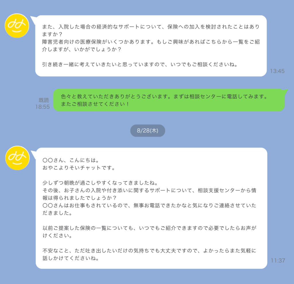 そんなとき、「医ケア児おやこよりそいチャット」は例えばこんなふうにサポートします。