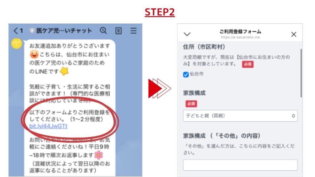- STEP2:自動メッセージで送られる利用登録フォームを入力してください(所要時間1~2分程度)