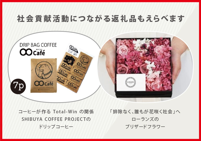 例えば、障害者の就労を支援するSHIBUYA COFFEE PROJECTのドリップコーヒーや、障がいや難病などの社会的障壁と向き合う当事者を積極的に雇用しているローランズのプリザーブドフラワーなど、社会貢献活動にもつながる返礼品もご用意しています。
