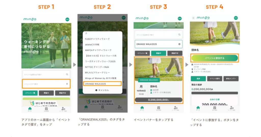 今年のORANGE WALKでは、アプリの参加者数と歩数に応じた金額が寄付先団体に支援されます。