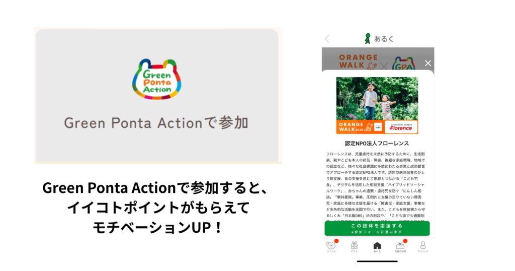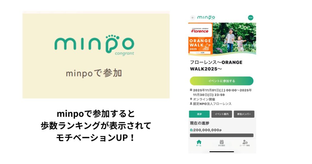 | ウォーク期間:11月1日(土)0:00〜11月30日(日)24:00 参加エントリー期間:10月17日(金)10:00〜11月30日(日)24:00 参加方法:スマートフォンアプリ「minpo」もしくは 「Green Ponta Action」から参加 |