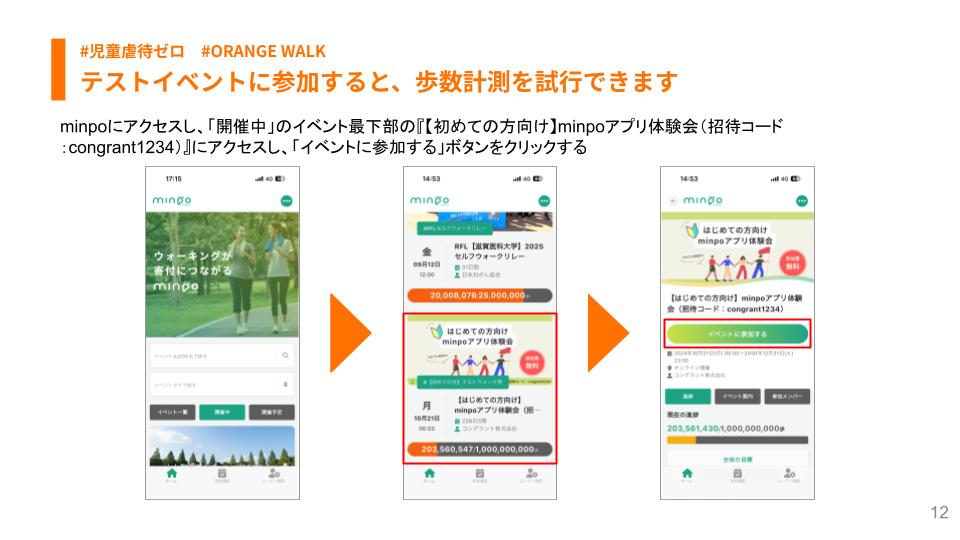 minpoにアクセスし、「開催中」のイベント最下部の『【初めての方向け】minpoアプリ体験会(招待コード:congrant1234)』にアクセスし、「イベントに参加する」ボタンをクリックしてください。歩数計測が試せるようになります。