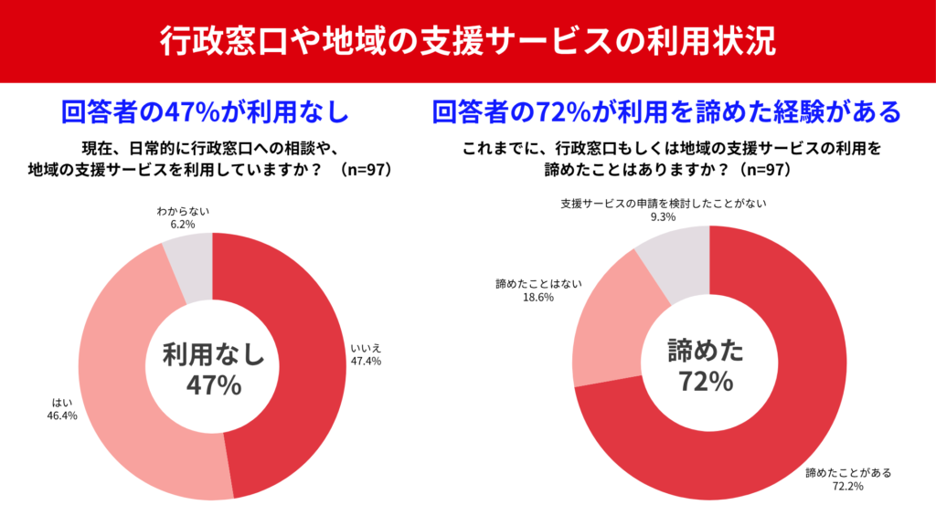 「現在、日常的に行政窓口への相談や、地域の支援サービスを利用していますか?」と尋ねたところ、「利用していない」が47%でした。また「これまでに、行政窓口もしくは地域の支援サービスの利用を諦めたことはありますか?」と尋ねたところ、「諦めたことがある」が72%であり、高い割合で断念した経験があることがわかりました。