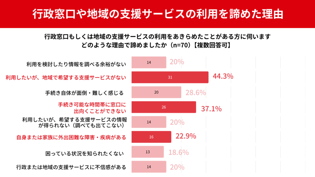 「諦めたことがある」と回答した72%(70世帯)のうち、どのような理由で諦めたかという問いでは、「利用したいが、地域で希望する支援サービスがない」(44%、31世帯)が最多で、「手続き可能な時間帯に窓口に出向くことができない」(37%、26世帯)という回答が続きました。