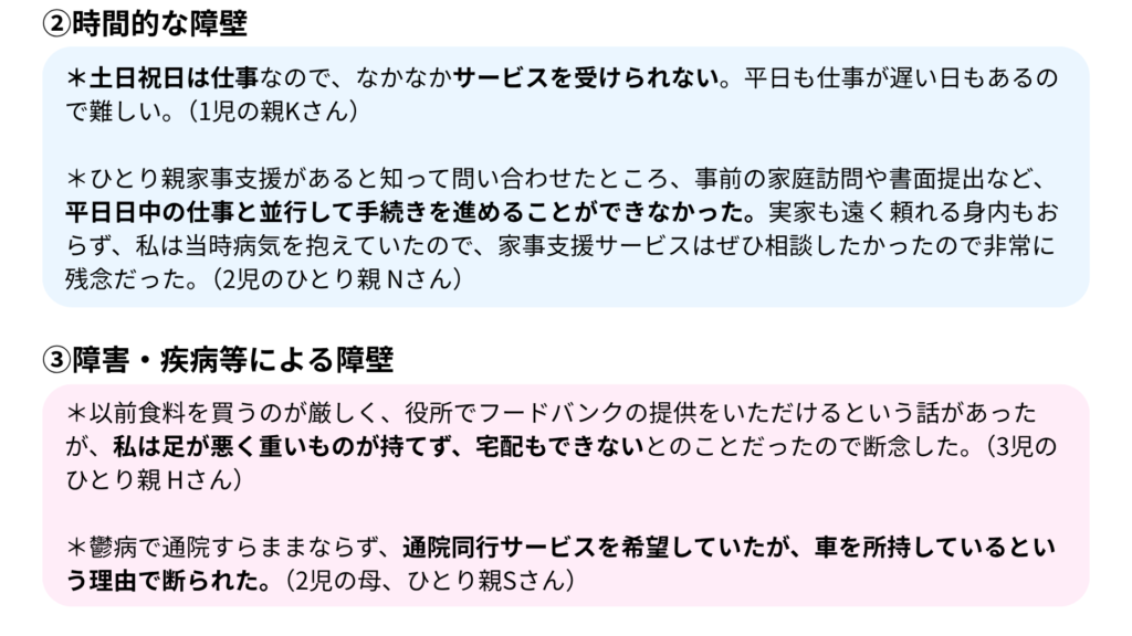 回答者のうち、72%が行政窓口・地域支援の利用を諦めた経験があることから、支援が必要だったにもかかわらず、つながれなかった親子が多くいることが明らかになりました。その理由としては、「地域や制度の障壁」「時間的な障壁」といった越えがたい困難があったことが示されています。また「自身または家族に外出困難な障害・疾病がある」も多く、相談者が支援場所まで出向く体制では、地域の支援にたどり着けない障壁があることも伺えます。