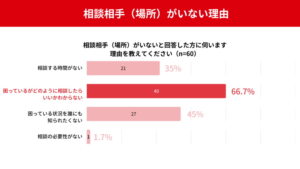 また孤独感に関する設問では、回答者の98%が『おやこよりそいチャット』利用前に孤独感を感じており、62%が現在も気軽に相談できる相手・場所が「いない」と回答。相談しない理由は、「困っているがどのように相談したらいいかわからない」(67%、40人)が最多でした。