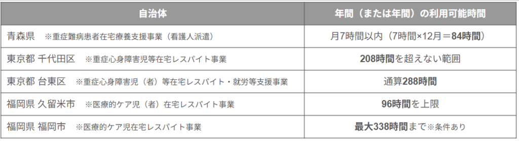 - 青森県HP「重症難病患者在宅療養支援事業」(最終閲覧:2025年10月21日)https://www.pref.aomori.lg.jp/soshiki/kenko/ganseikatsu/nanbyo_respite.html ,千代田区HP「重症心身障害児等在宅レスパイト事業」(最終閲覧:2025年10月21日) https://www.city.chiyoda.lg.jp/koho/kosodate/kosodate/ko-shogai/goriyo/respite.html,台東区HP「台東区重症心身障害児(者)等在宅レスパイト・就労等支援事業」(最終閲覧:2025年10月21日) https://www.city.taito.lg.jp/kenkohukusi/shogai/service/zaitakuresupaito.html,久留米市HP「医療的ケア児(者)在宅レスパイト事業」(最終閲覧:2025年10月21日) https://www.city.kurume.fukuoka.jp/1070kenkou/2010fukushi/3030shougaishazaitaku/iryoutekikeajisyazaitakuresupaitojigyou.html,福岡市HP「福岡市医療的ケア児在宅レスパイト事業の利用について」(最終閲覧:2025年10月21日) https://www.city.fukuoka.lg.jp/kodomo-mirai/shogaijishien/health/syogaij-sien/ikeaji-resupaito.html