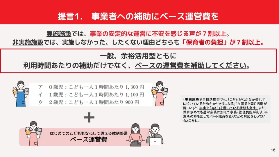 国からの補助金は、お子さんをお預かりした保育時間だけが対象となり、その前後のプロセス、例えば利用前の見学対応や保護者との面談時間、事務作業コストは対象になりません。また、日常的に通園していないこどもに対する安全な人員配置をおこなうためにも、事業実施においては追加の費用発生は避けられず、利用者の安全と安定的な事業運営のためにも、保育時間に応じた補助以外にもベース運営費を補助するよう提言しました。