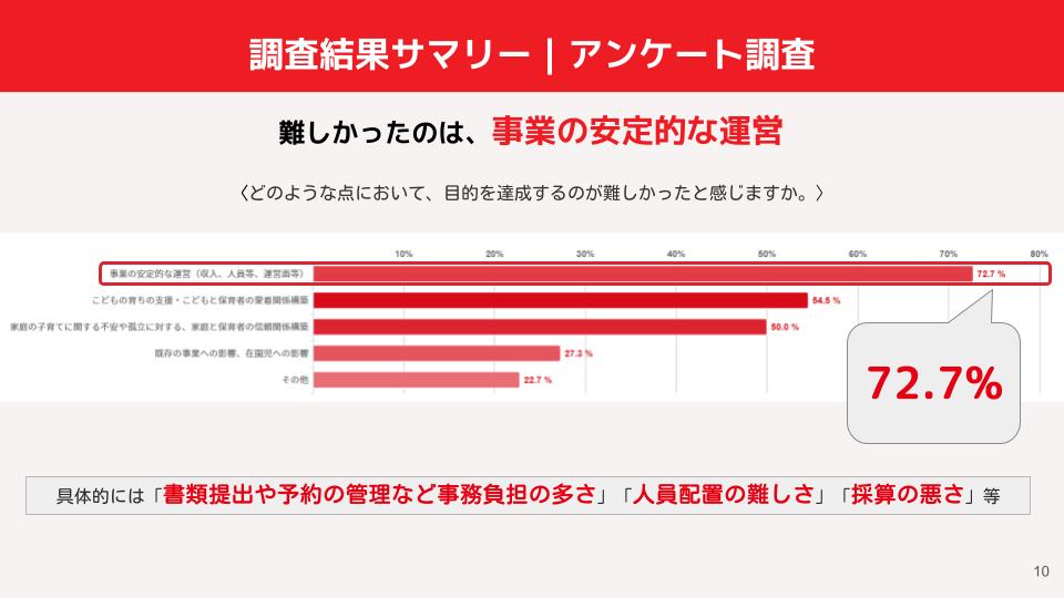 「どのような点において、『全てのこどもの育ちを応援し、全ての⼦育て家庭に対し支援を強化』するためという目的を達成するのが難しかったと感じますか」の問いに対し一番多かった回答は「事業の安定的な運営(収入、人事等、運営面等)」で72.7%でした。具体的には「書類提出や予約の管理など事務負担の多さ」「人員配置の難しさ」「採算の悪さ」などが挙げられました。