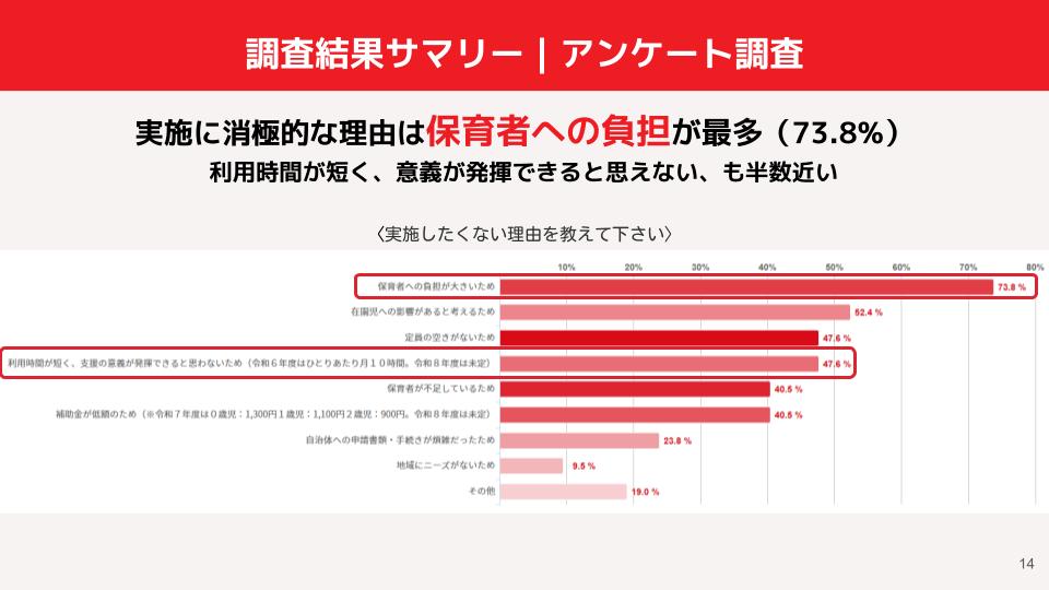 今回のアンケート結果からは、事業を実施した施設は制度の意義を強く感じているものの、「事業の安定的な運営」と「施設・保育者への負担」が主要な懸念点であることがわかりました。非実施施設においても、「保育者の負担の大きさのイメージ」に加え、「補助金の低さ」「利用時間の短さ」が、制度開始前から実施を阻む大きな要因となっていることが明らかになりました。