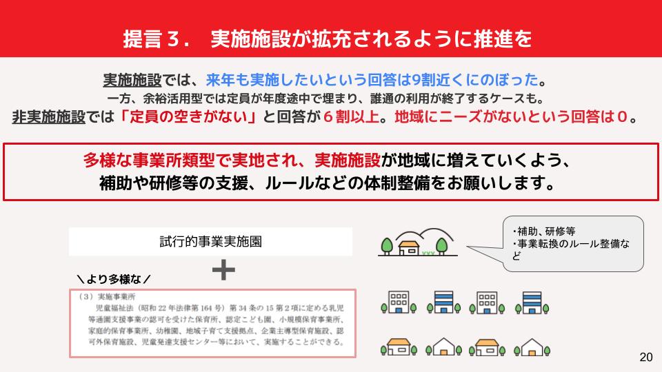 本制度は、多様な施設(認定こども園、小規模保育事業所、地域子育て支援拠点、児童発達支援施設など)において実施できることになっています。来年度からの全国実施に向けては、すべての家庭がより保育にアクセスしやすくなるために、実施施設数が増えるよう、実施事業者に対する補助や研修等の支援、多様な事業者の参画をスムーズにするような制度の整備を提言しました。