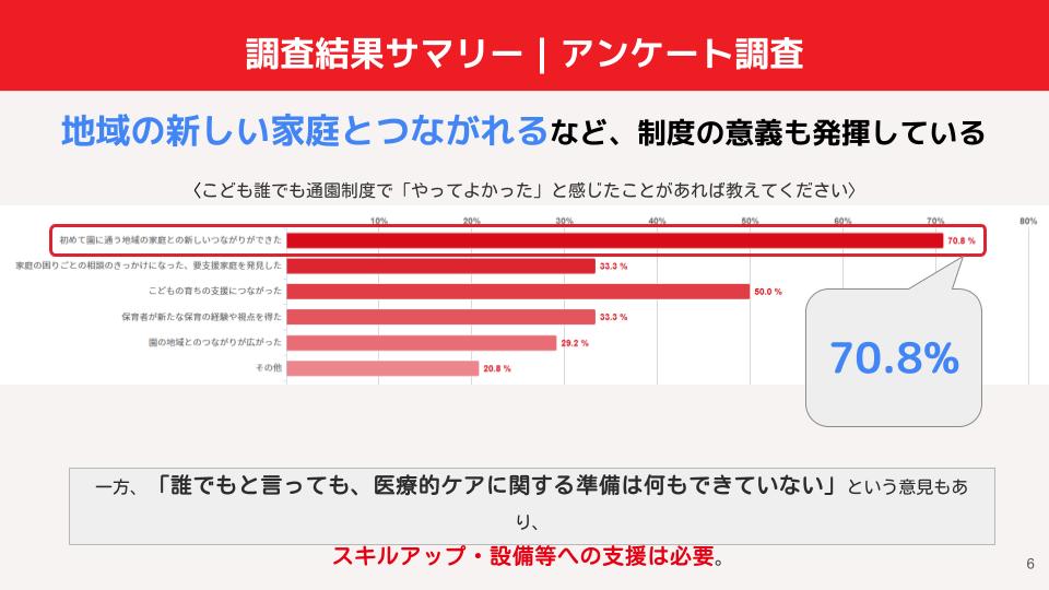 こども誰でも通園制度を「やってよかった」と感じた点として、「初めて園に通う地域の家庭との新しいつながりができた」が最多で70.8%でした。