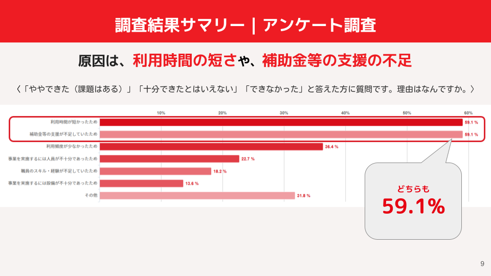 原因として、「利用時間が短かったため」と「補助金等の支援が不足していた」が同率で59.1%に上りました。
