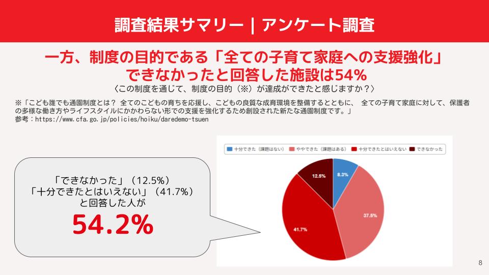 こども誰でも通園制度の目的は、全ての子育て家庭に対して、保護者の多様な働き方やライフスタイルにかかわらない形での支援を強化することです。これが「できなかった」「十分にできたとはいえない」と回答した施設が54%にのぼり、目的の達成には課題が残る結果となりました。