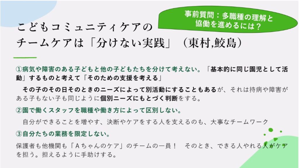 「多職種の理解と協働を進めるには?」「医療的ケア児があたりまえに保育園に通える未来を実現するためには、何が必要か?」といった質問をはじめ、沢山の事前質問にも丁寧にご回答いただきました。