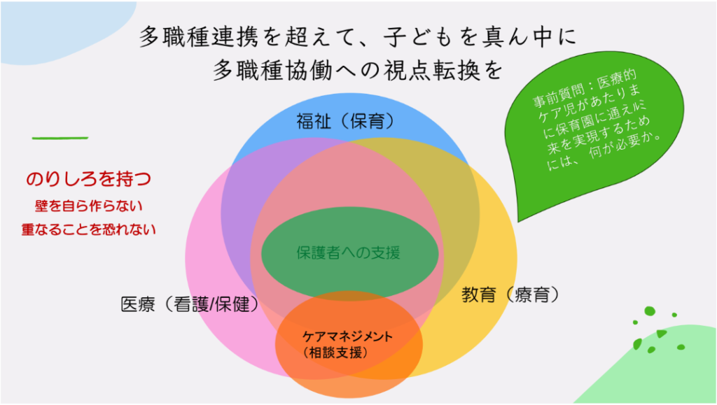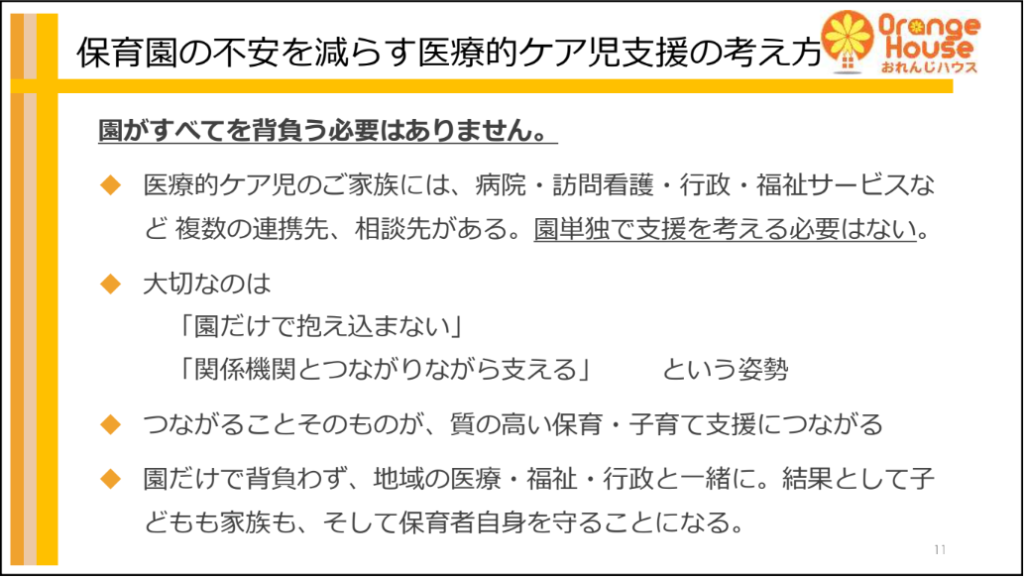 さらに、医療的ケア児を受け入れる際の考え方として「園がすべてを背負う必要はありません」「行政・関係機関・福祉サービスなど複数の連携先・相談先があることが大切」というメッセージもいただきました。医療的ケア児のご家庭がすでにつながっている関係機関に加え、園もつながりながら一緒に支えることが大切です。
