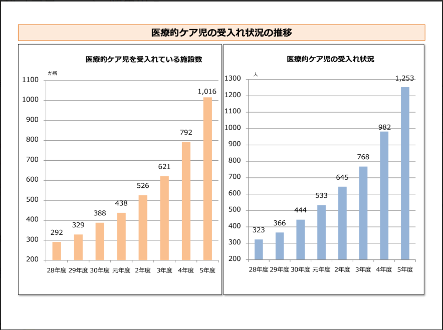 さらに、医療的ケア児の受け入れ状況について全国の施設数と児童数の推移をご説明いただきました。両方とも着実に増加していることが分かります。