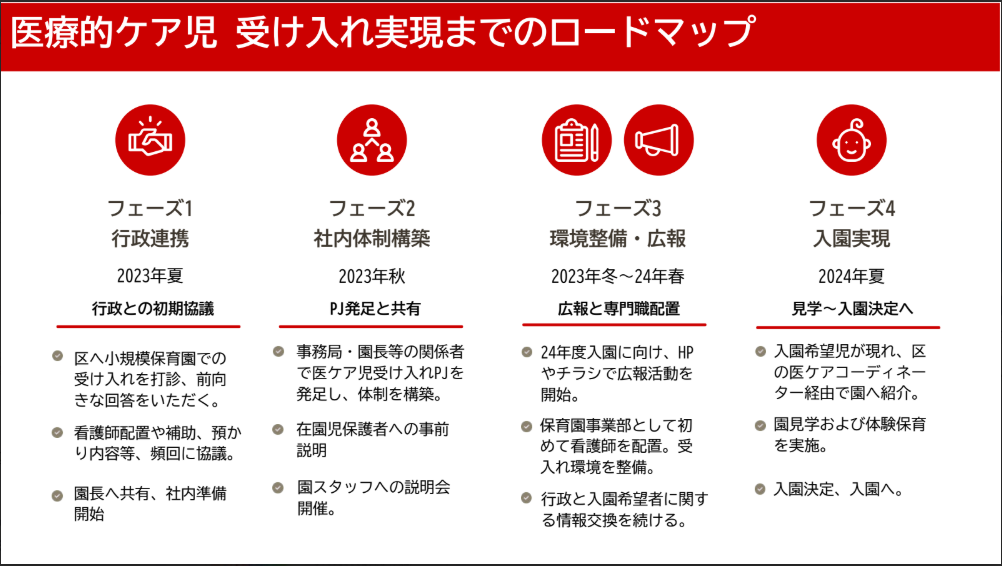 弊会からも一保育事業者として、小規模認可保育園での医療的ケア児の受け入れ実現までのロードマップについて、みらいの保育園事業部マネージャー川口よりお話ししました。