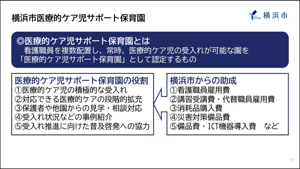 看護職員を複数配置し、常時、医療的ケア児の受け入れが可能な園を認定する「横浜市医療的ケア児サポート保育園」という横浜市独自の取り組みについてもご紹介いただきました。