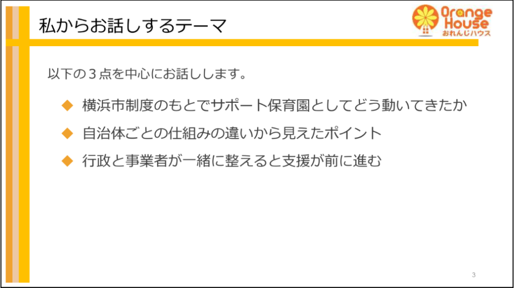 続いて、横浜市と東京都で複数の保育園を運営する認定NPO法人おれんじハウスの中陳(なかぜ)理事長より、スライドの3つのテーマを中心にご説明がありました。
