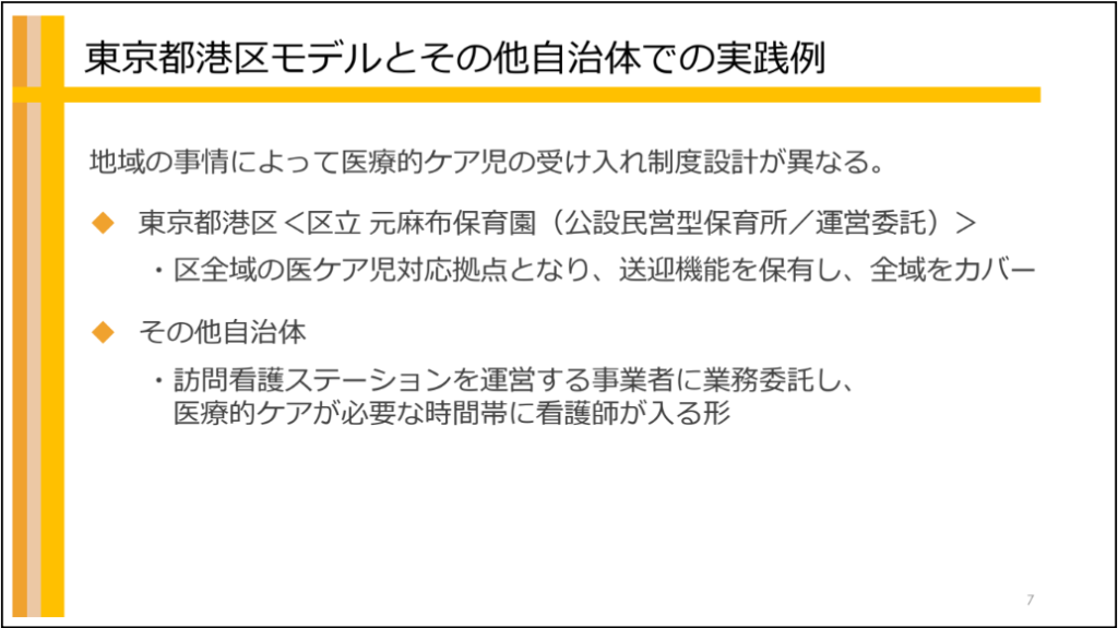 一方、共同事業体として運営する港区立元麻布保育園は、区全域の医療的ケア児の拠点となる施設として送迎も行っています。横浜市と港区ではカバーする面積が異なり、港区は比較的狭いためこのような形をとっているそうです。また、その他の自治体においても、地域の実情に合わせた柔軟な制度設計がなされていることをご紹介いただきました。