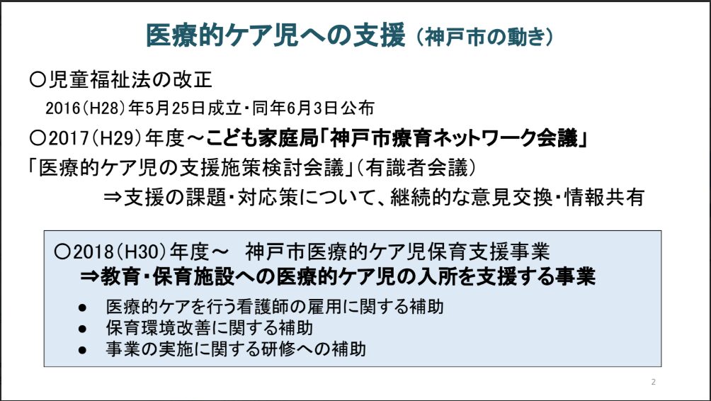 神戸市 こども家庭局 幼保事業課からも神戸市の医療的ケア児の受け入れ体制、現在の状況、独自の取り組みなどをお話しいただきました。