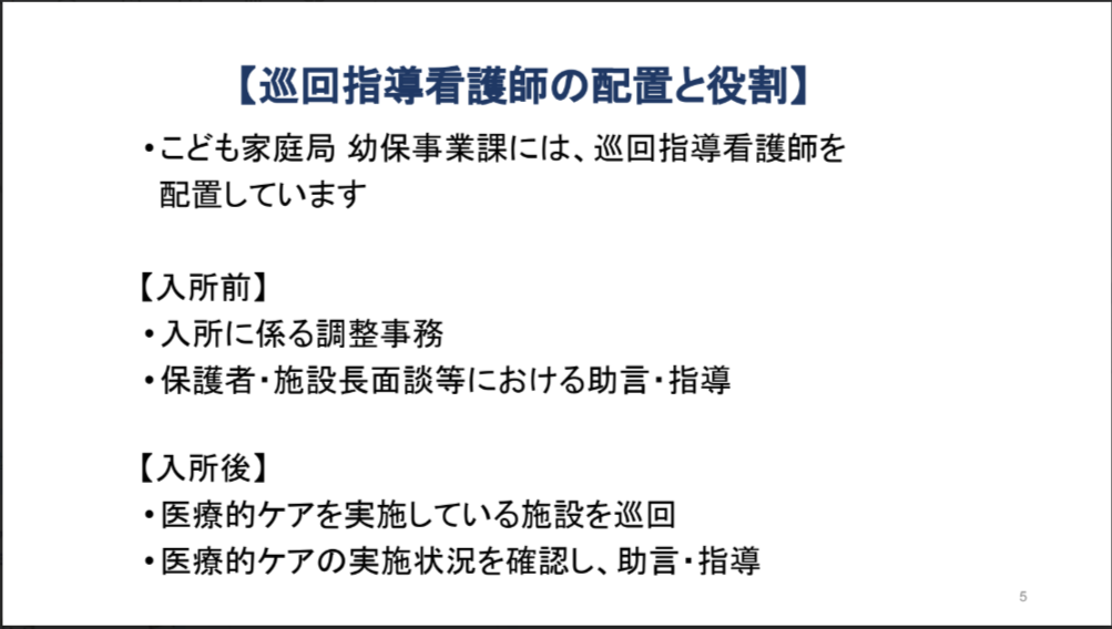 はじめに、こども家庭庁成育局保育政策課より、医療的ケア児の保育に関する国の補助事業についてご説明いただきました。